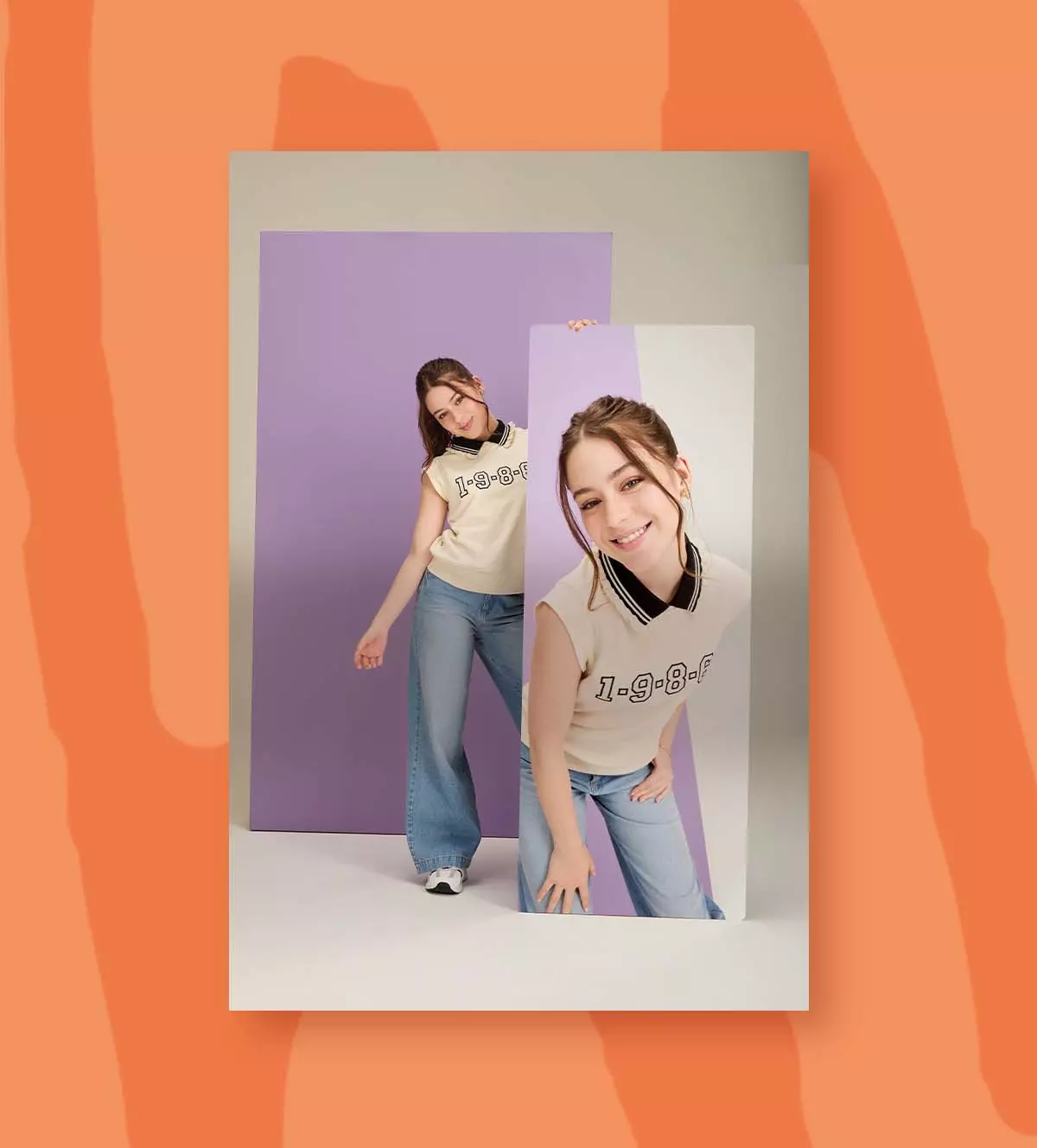 Lo que hizo único este proyecto fue la integración de espejos dentro de las composiciones fotográficas, añadiendo profundidad, dinamismo y un gesto conceptual alineado al espíritu varsity y moderno de la marca.